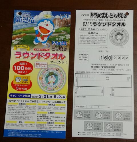 文明堂 ドラえもんどら焼きラウンドタオルプレゼントキャンペーン キャンペーン期間 05/02まで 応募締切 20/05/20 けっこう間が空いてます 限定パッケージなのかな 応募マーク系ははやめに商品確保しておくのが 無難です 応募マーク5枚必要です store.shoppi…