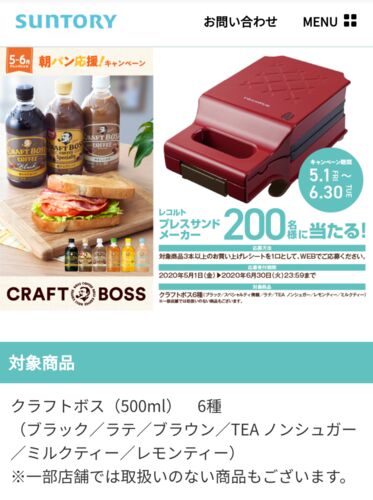 懸賞なび 2020年 07 月号 [雑誌] サントリークラフトボス × タカキベーカリー 朝パン 応援キャンペーン 締切 20/06/30 賞品はこちら レコルト プレスサンドメーカー キルト レッド RPS-1 数年前に当選しました タイマーはついてませんが 故障もなく、不満も…