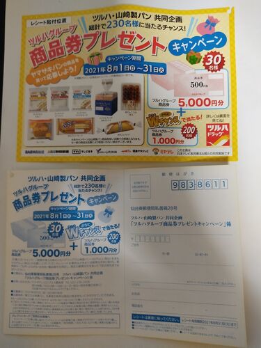 小袋ジャムアソート 8種類×2袋 (16袋入) 商品券が当たる懸賞です ツルハ×山崎製パン 東北限定キャンペーン 《有効期限》 2021年8月31日 《締切》 2021年9月3日 新着はがき見つけました! 恒例のキャンペーンですね~ 毎年応募はしてますが 当たった記憶…