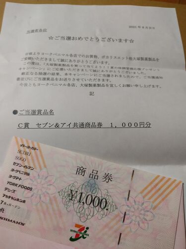 リンク 8月5個目 ヨークベニマル×大塚製薬 商品券1000円 ようやく会えたよ この薄ピンクの商品券 1枚だけだけどね なんとかC賞当たったみたい 作りやすい条件だったから 4口くらい応募しちゃった 切手代とか差し引くと ちょっとむなしくなっちゃう…