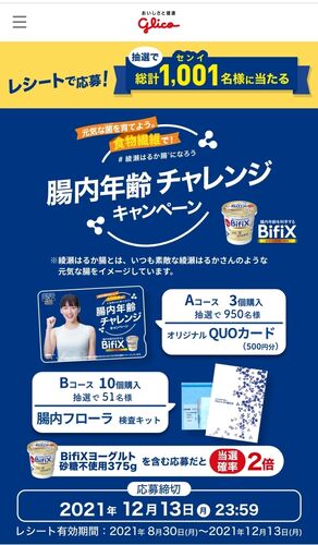 クオカードなどが当たる懸賞です BifiX 腸内年齢チャレンジキャンペーン 【応募締切日】2021年12月13日 BifiX 腸内年齢チャレンジキャンペーン | BifiXヨーグルト | グリコ BifiXはわたしの推しヨーグルトなんですが (便秘にすごく効く) 3個で500円…
