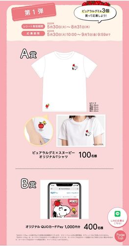 ピュアラルグミ×スヌーピー オリジナルTシャツなどが当たる懸賞情報です