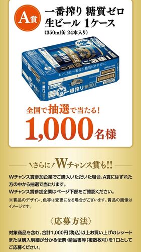 一番搾り 糖質ゼロ生ビール 1ケース(350ml缶 24本入り) 抽選で1,000名様に当たる懸賞情報です