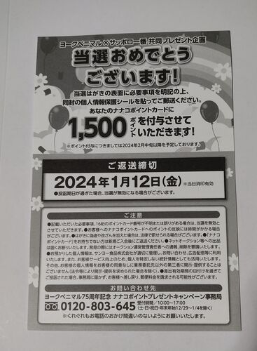 当選品 12月11個目 ヨークベニマル×サッポロ一番 ナナコポイント 1500円分