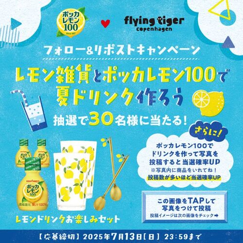 ポッカレモン100 (70ml) 3個、Flying Tiger Copenhagen レモングラス2個、レモンスプーン1セット(2本)が当たる懸賞情報です