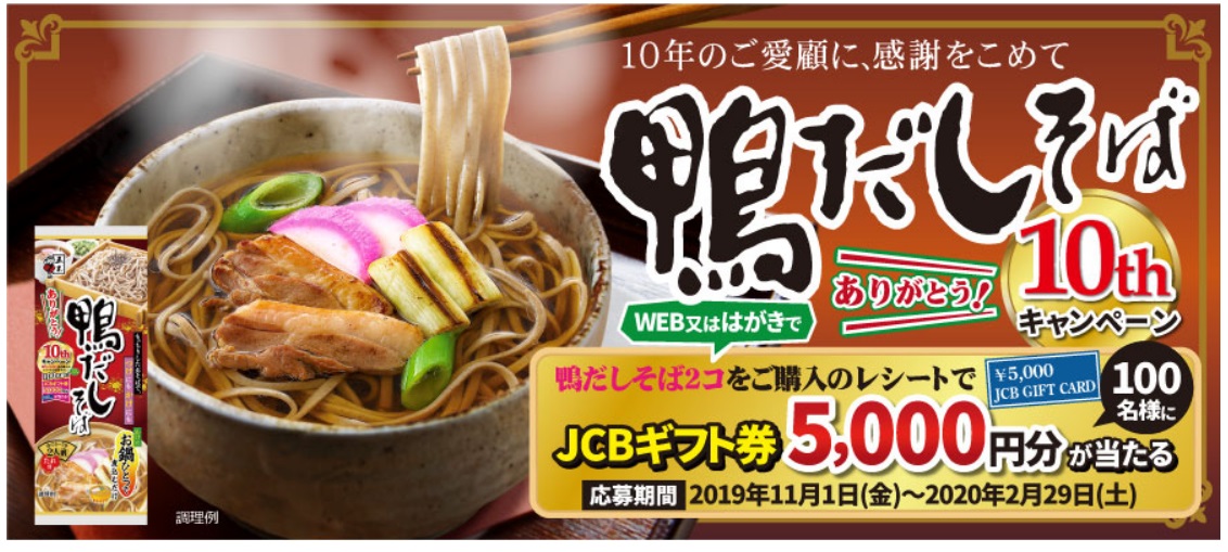 2020-01-03 【20/02/29】ありがとう!鴨だしそば10周年【レシ・WEB・はがき】 全国懸賞 www.itsukifoods.jp レシート対象期間及び応募締切2019年 11月1日(金)~2020年 2月29日(土) ●対象商品2個分を1口。 ●複数のレシートを合算してのご応募も可能 賞品/当選者数JCBギフト券(5,000円分)/100名 JCBギフト券はクオカードよりテンション あがる賞品です WEB応募で切手代かかからない のもうれしい 対象商品を見つけるのが ちょっと大変そうです リンク お役にたてましたら ぽちっとおねがいします にほんブログ村