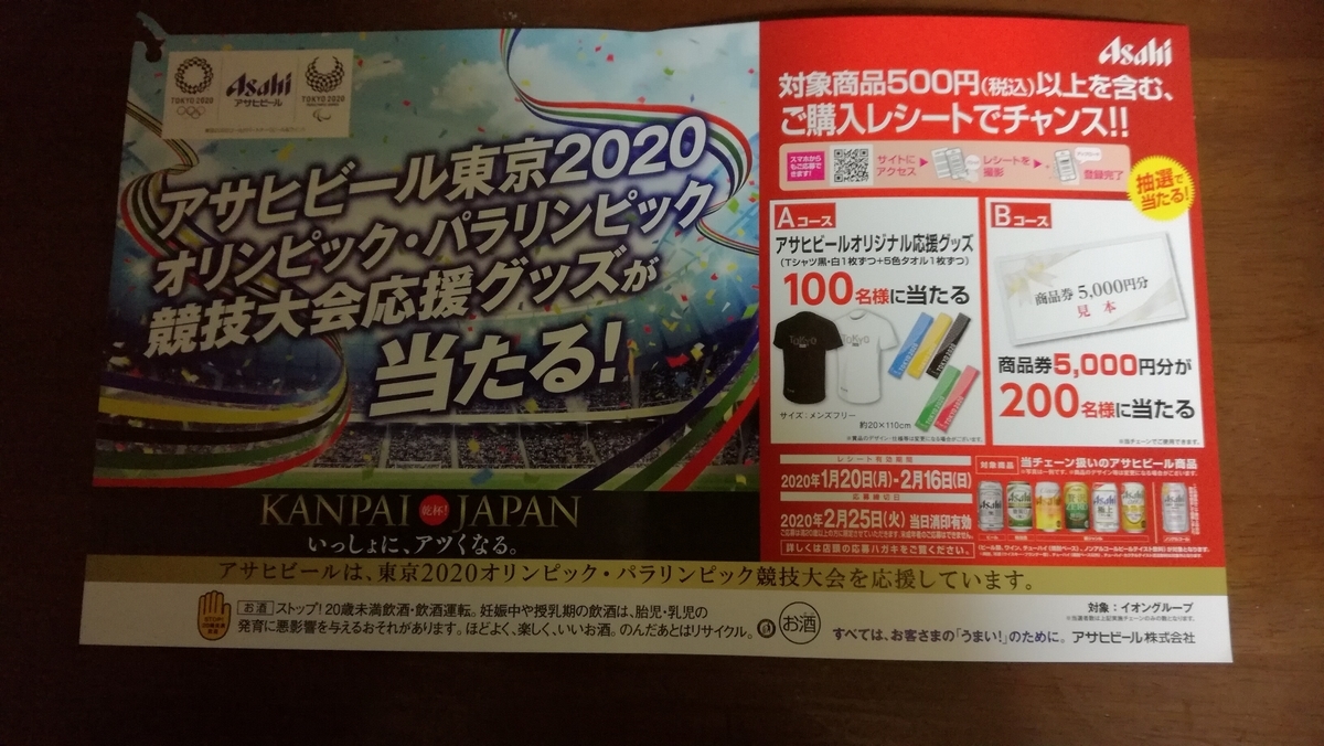 2020-01-23 【20/02/16】アサヒビール×イオングループ オリンピックキャンペーン 【レシ・スマホ・はがき】 イオン アサヒビール×イオングループ オリンピックキャンペーン 有効期間 20/01/20から20/02/16 応募締切 20/02/25 やっと応募できるビールの懸賞が来ました 合計金額500円分のレシート チューハイもOKなのがうれしい 商品券5000円コースを狙います リンク 今話題の、、、、 まぁまぁおもしろかったです 雰囲気があって でも1回観れば充分なかんじ リンク 私はデートの続編が見たい コンフィデンスマンよりも デートの最終話 本当に好き お役にたてましたら ぽちっとおねがいします にほんブログ村