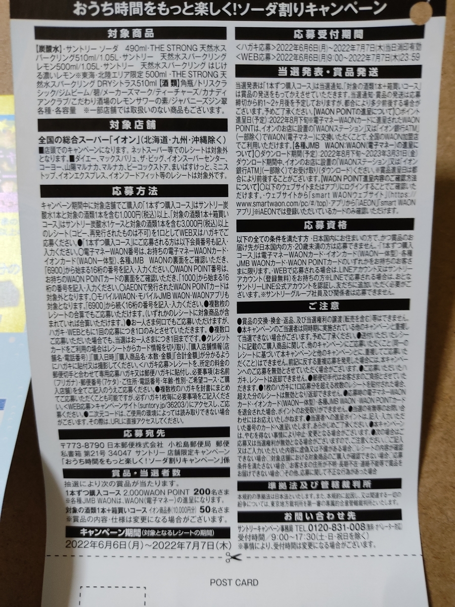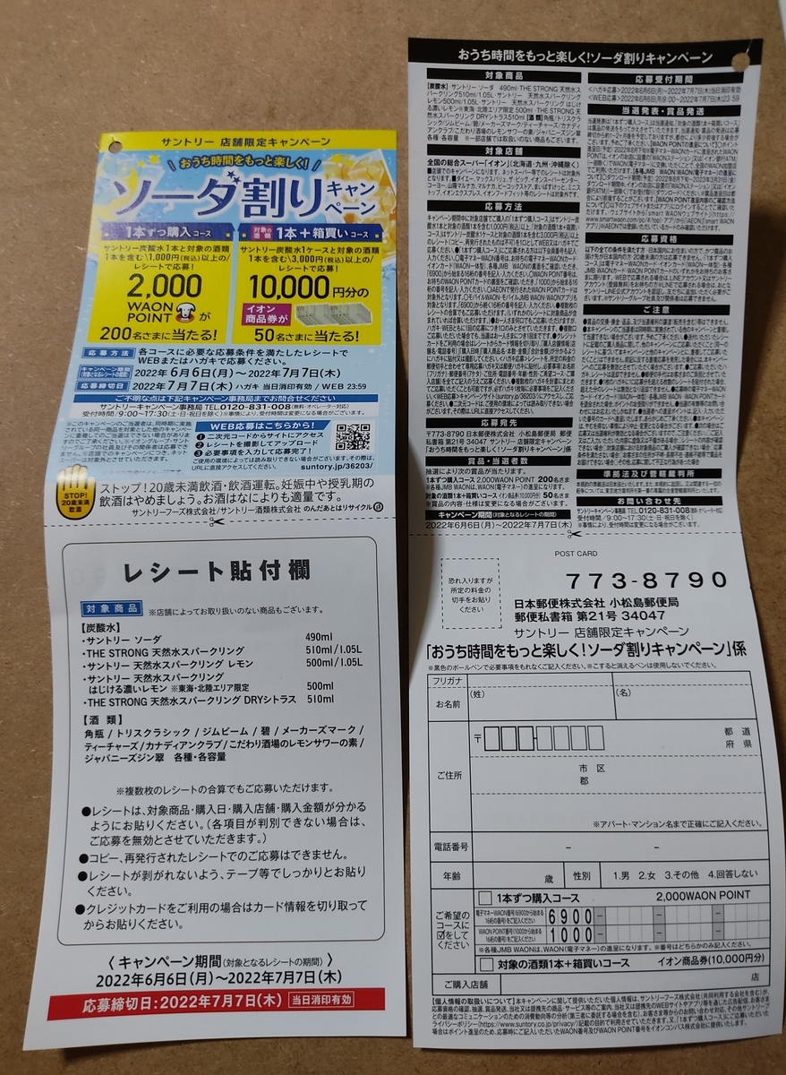 キャンペーン期間中に対象店舗でご購入の「1本ずつ購入コース」はサントリー炭酸水1本と対象の酒類1本を含む1,000円(税込)以上、「対象の酒類1本+箱買いコース」はサントリー炭酸水1ケースと対象の酒類1本を含む3,000円(税込)以上のレシート(コピー、再発行されたものは不可)を1口としてWEB又はハガキでご応募ください。