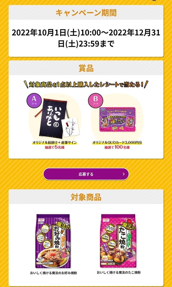 「おいしく焼ける魔法のお好み焼粉」または「おいしく焼ける魔法のたこ焼粉」