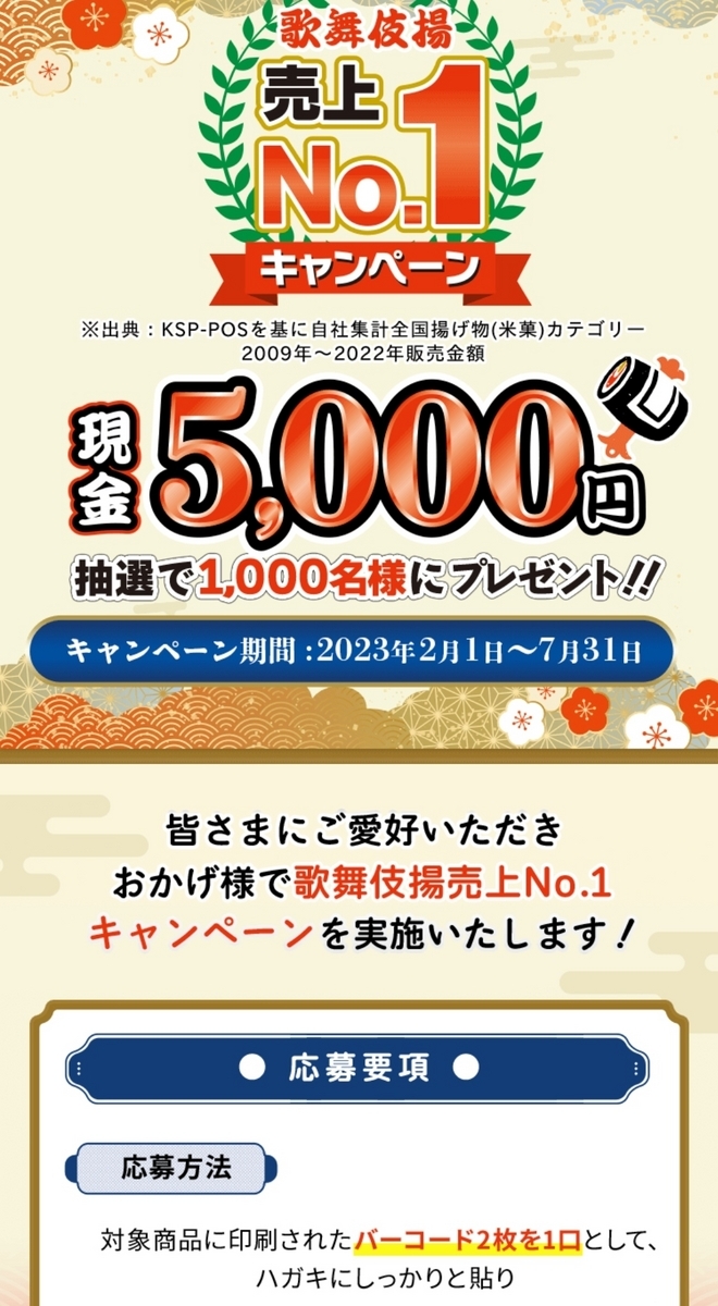 歌舞伎揚売上No.1キャンペーンその1:現金5000円プレゼント|天乃屋