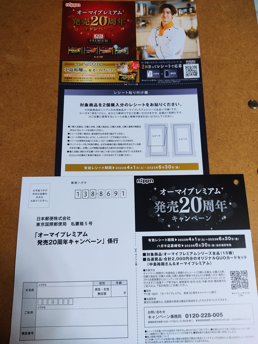 オーマイプレミアムオリジナル中島裕翔さんQUOカードが当たる懸賞情報です
