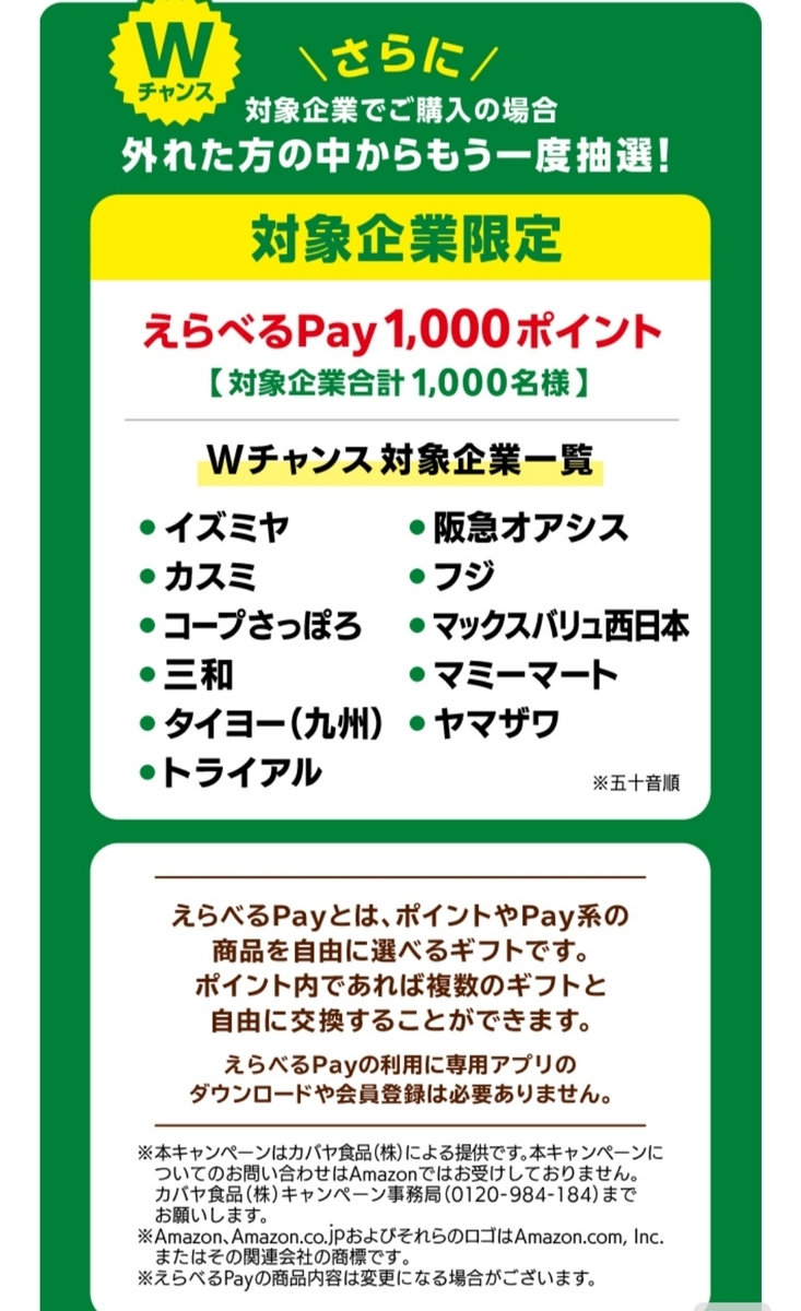 Wチャンス対象企業で対象商品を購入したレシート画像でご応募いただくと、Wチャンス賞として、外れた方の中から抽選で1,000名様に「えらべるPay1,000ポイント」をプレゼントいたします。 ※Wチャンス対象企業で購入したレシートでのみご参加いただけます。 ※Wチャンスには当選確率UPは適用されません。 |