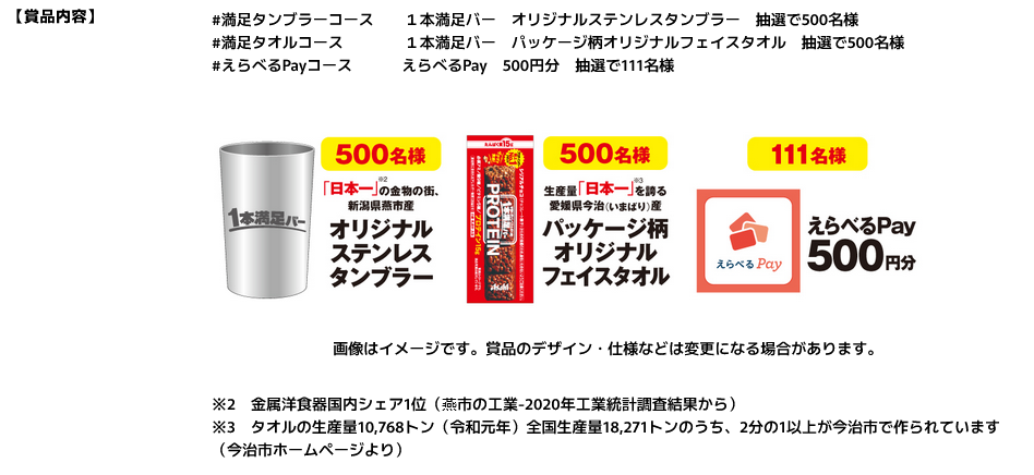 | 【応募対象商品】 | 1本満足バープロテインシリーズ・ギガプロテインシリーズ (対象商品) プロテインチョコ プロテインストロベリー プロテインブラック プロテインホワイト プロテインベイクドチーズ プロテインベイクドキャラメル ギガプロテイン チョコ ギガプロテイン キャラメル |