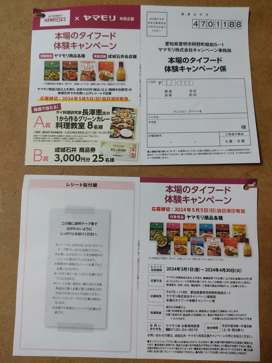 ヤマモリ対象商品2品以上を含む、成城石井でのお買い上げ合計金額500円(税 応募方法込)以上のレシートを専用応募ハガキ、もしくは郵便ハガキ(封書も可)に添付し、 郵便番号、住所、氏名、電話番号、ご希望の賞品を明記の上、ご応募ください。