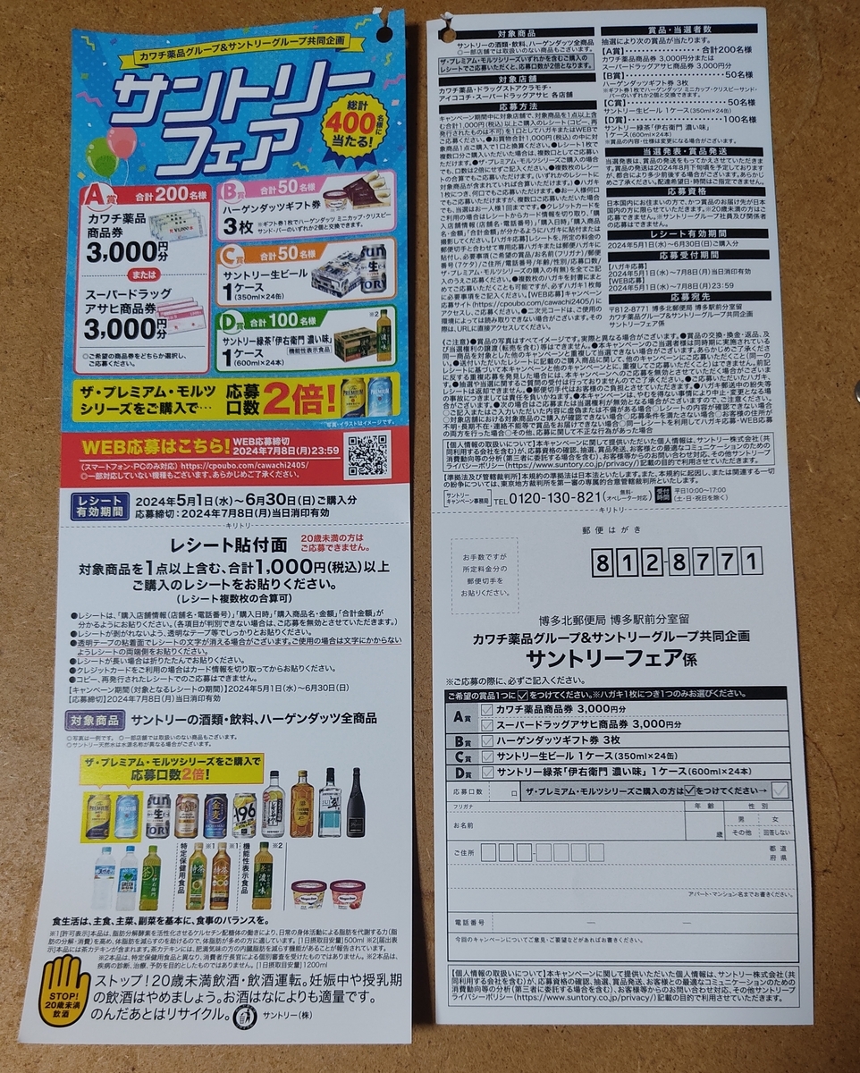 キャンペーン期間中に対象店舗で、対象商品を1点以上含む、合計1,000円(税込)以上ご購入のレシート(コピー、再発行されたものは不可)を1口としてWEBまたはハガキでご応募ください。
