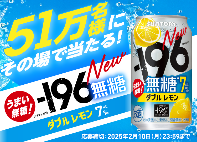 サントリー -196無糖〈ダブルレモン〉1本無料引換えクーポンが51万名にその場で当たる!キャンペーン