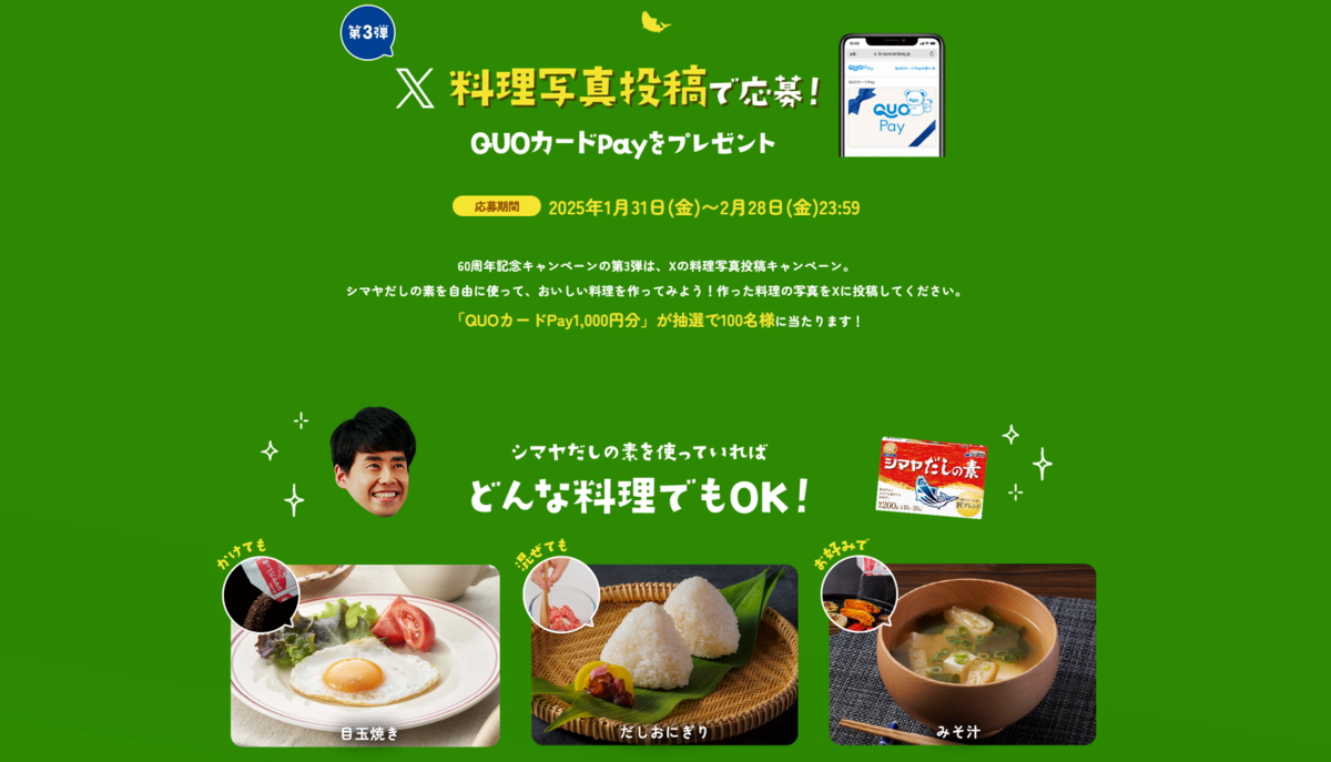 シマヤだしの素公式Xアカウント「@dashiwaza55」をフォローの上、キャンペーン期間中に、シマヤだしの素を使った料理の写真と「#自由だしチャレンジ」「#シマヤだしの素」の2つのハッシュタグをつけて、Xに投稿してください。抽選で100名様に「QUOカードPay 」1,000円分をプレゼントします。