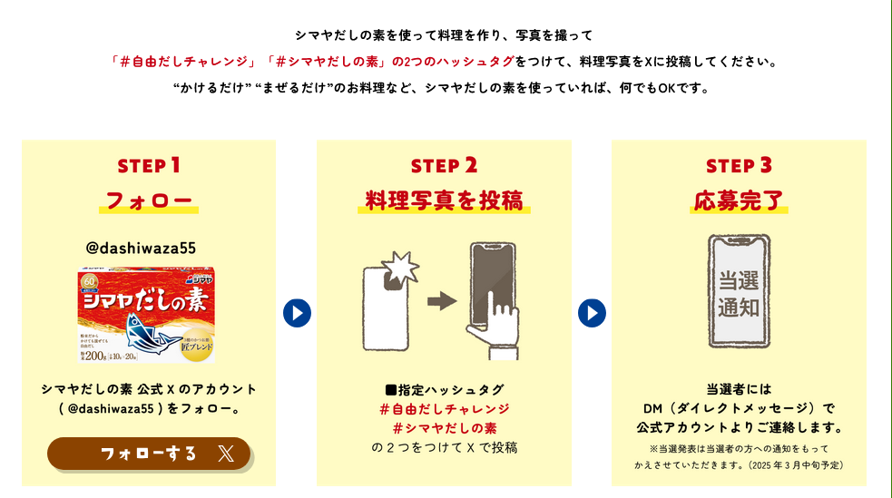 (1) シマヤだしの素公式Xアカウント「@dashiwaza55」をフォローしてください。
