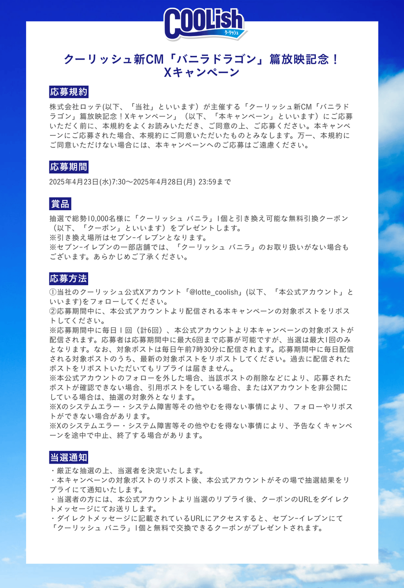 ロッテ クーリッシュ公式X主催のオープン懸賞です