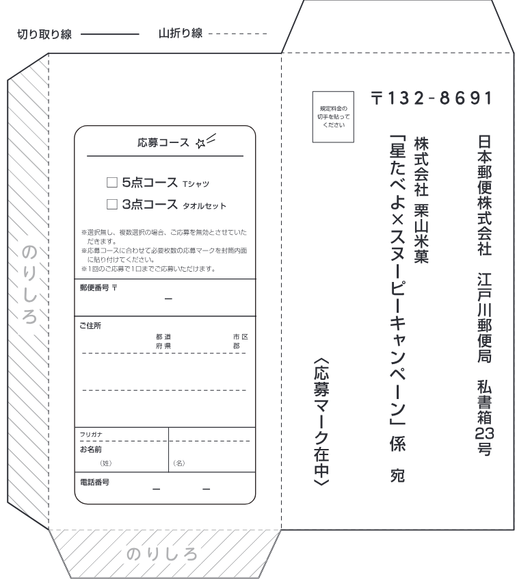 対象商品パッケージ裏面のを1口として、に透明テープなどでしっかりと貼り、必要事項【お名前・郵便番号・住所・電話番号 ・ご希望のコース】を明記のうえ、規定料金の切手を貼って下記の応募先までご郵送ください。