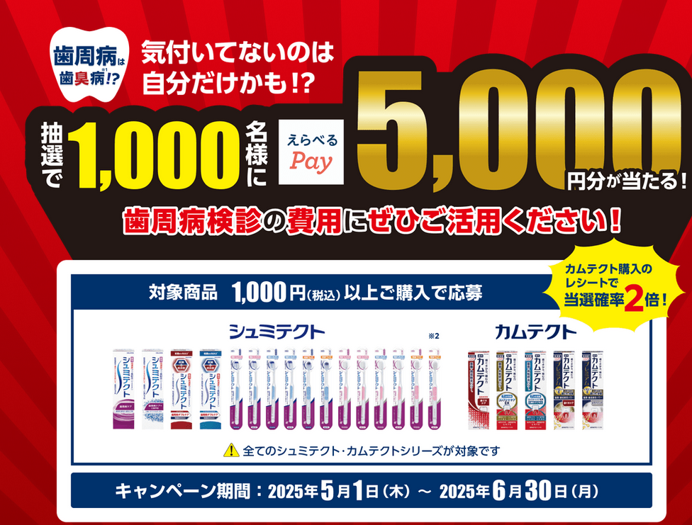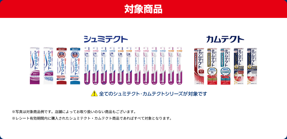 キャンペーン応募期間中、下記対象のハミガキとハブラシを税込み1,000円以上お買い上げされた方は、キャンペーンページの応募ページにて応募フォームへご回答の上、ご購入した際のレシートの画像を応募ページにて添付する方法により、ご応募ください。