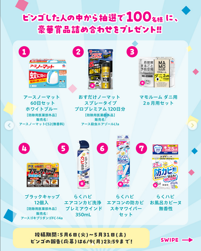 ③ビンゴになった場合は、アース製薬公式Instagram(@earthofficialjp)宛に、DMでビンゴになったカードの写真を数字が見えるように送付してください。抽選で100名様に、豪華賞品をお届けいたします。