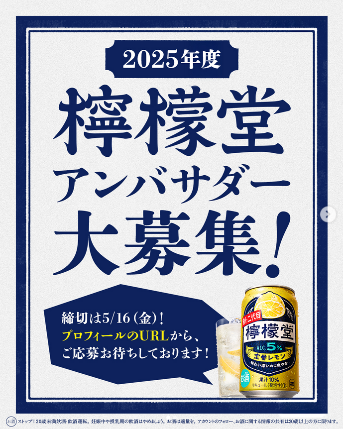 厳正なる選考の 上、2025年5月下旬頃、 応募フォームにご記入いただいたInstagramアカウント宛に、檸檬堂公式Instagramアカウント(@lemondo_jp)よりDMにてご連絡いたします。