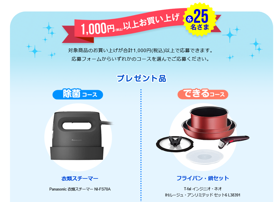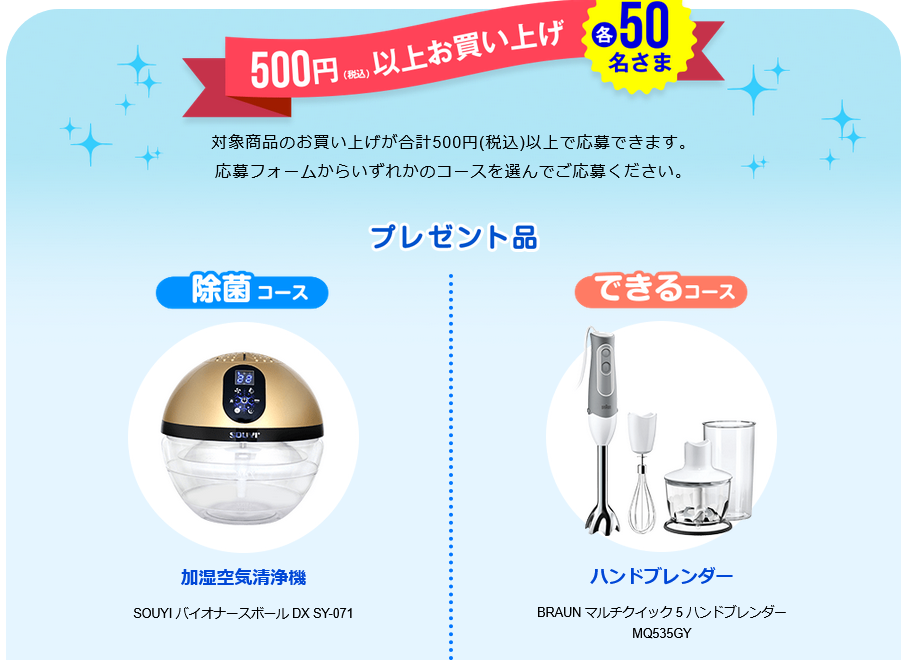- キャンペーン期間中に、対象商品の購入金額が合計で500円(税込)以上、または1,000円(税込)以上のお買い上げレシートでご応募いただくと、抽選で合計500名さまに賞品をプレゼントします。