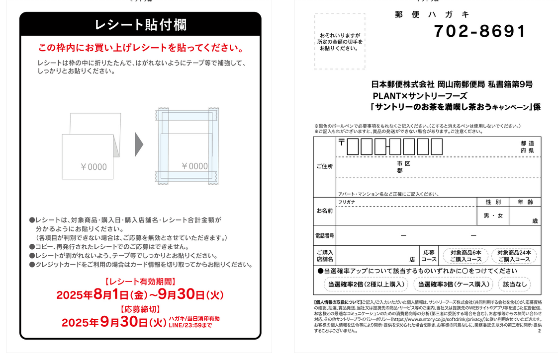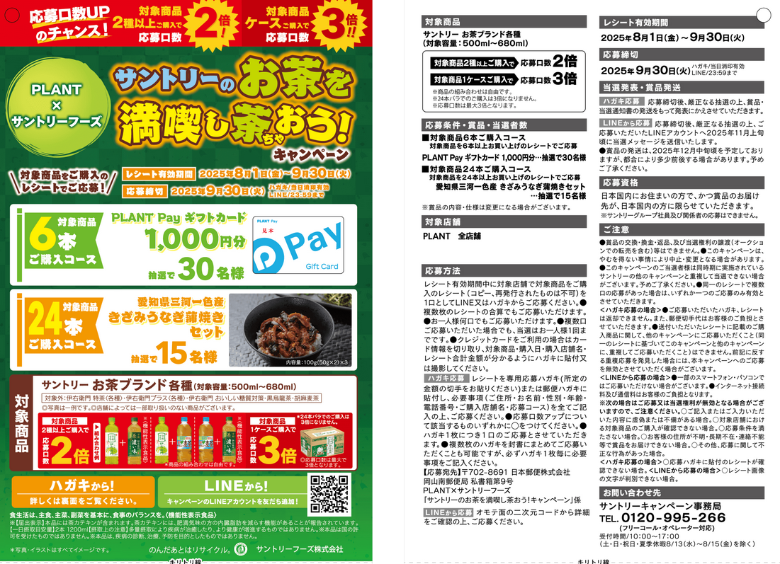 ★2025年8月1日(金)開始、 大阪屋ショップ、PLANT、アピタ・ピアゴ・ユーストア、ドラッグスギヤマ、V・drug(V・ドラッグ)、酒のすぎた、酒ゃビック、一号館・F☆マート、ぎゅーとら、ドラッグユタカ、杏林堂薬局、タカラ・エムシー、しずてつストア、田子重×サントリー お茶のクローズド懸賞です