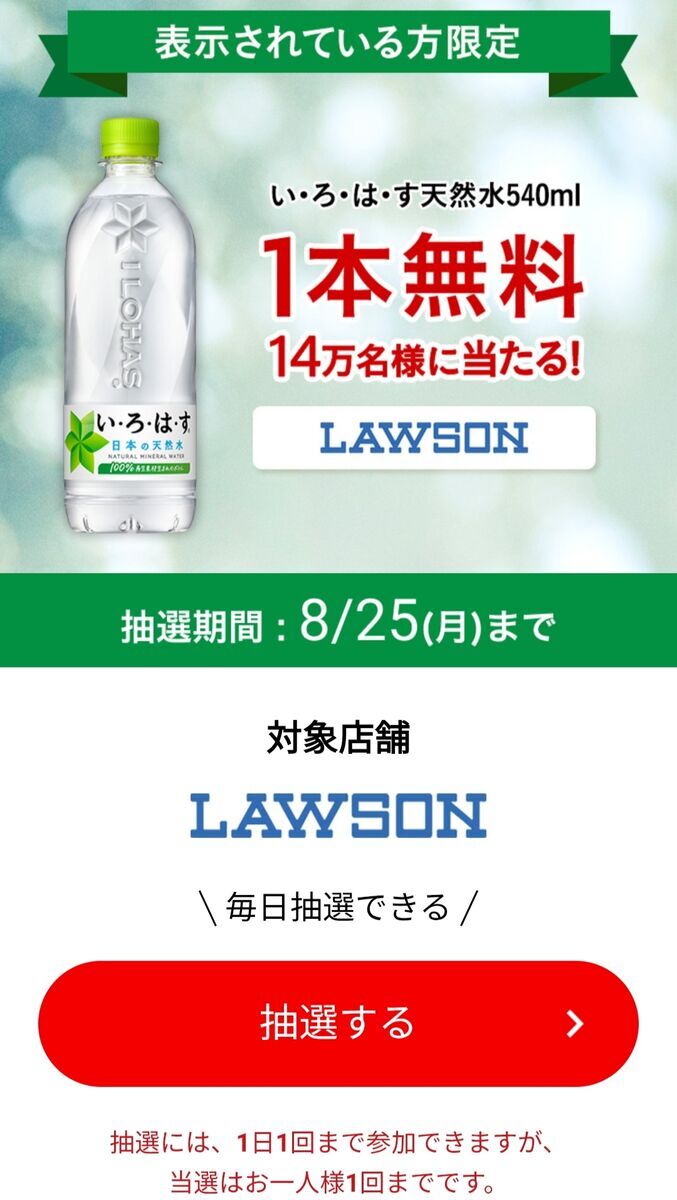 ・抽選には、 1日1回まで参加できますが、 当選は お一人様1回までです。