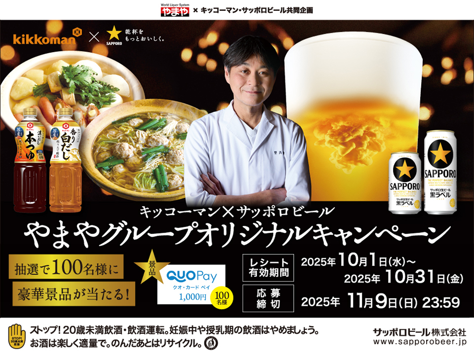 ★ 2025年10月1日(水)開始、キッコーマン×サッポロビール やまやグループのクローズド懸賞です