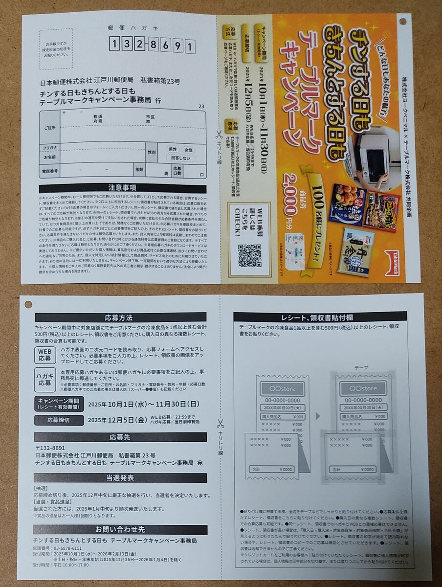 テーブルマークの冷凍食品1品以上を含む500円(税込)以上のお買い上げレシート、領収書を専用WEBフォームまたはハガキから応募してくださった方を対象に、抽選で賞品をプレゼントいたします。