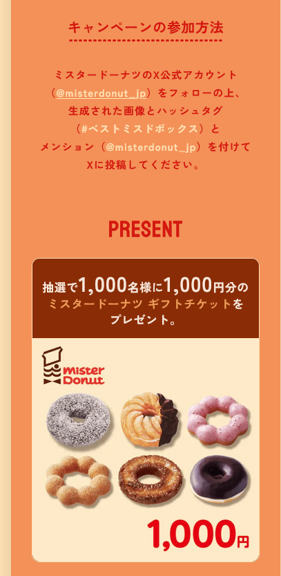 ③ミスタードーナツのX公式アカウントをフォローの上、①で生成された画像を、ハッシュタグ(#ベストミスドボックス)とメンション(@misterdonut_jp)を付けてXに投稿してください。
