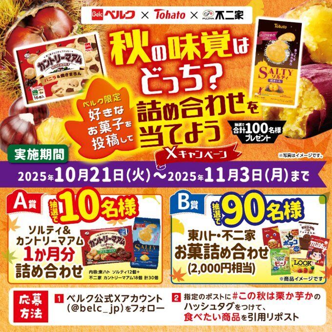 のハッシュタグをつけて「ソルティ焼き芋」「カントリーマアムバニラ&焼きまろん」のどちらが食べたいか引用リポストで投稿していただいた方の中から抽選で計100名様に「東ハト・不二家お菓子詰め合わせ」をプレゼントいたします。