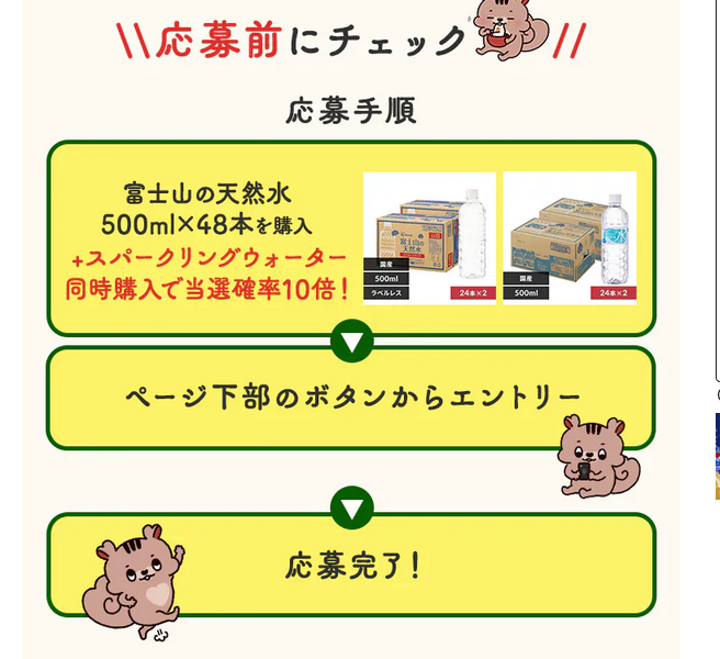 各ご注文ごとに、 「富士山の天然水 500ml×48本」 の購入数をもとに応募口数を計算します。