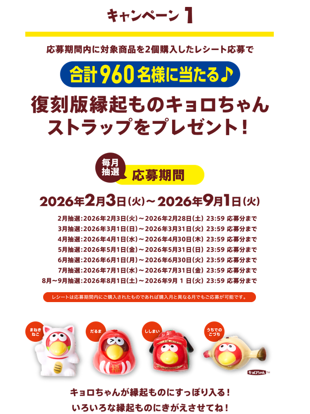 - 「縁起ものキョロちゃんストラップ」は対象商品を2個ご購入につき、1口の応募可能です。