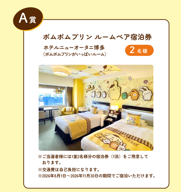 【A賞】ポムポムプリン ルーム ペア宿泊券 ホテルニューオータニ博多(ポムポムプリンがいっぱいルーム) 2名様