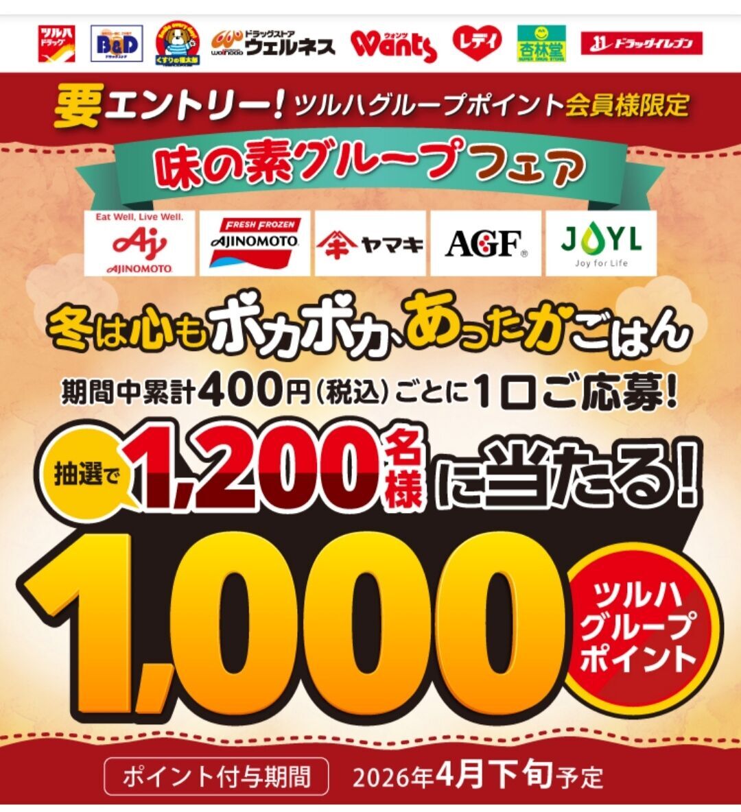 2026年1月16日(金)開始、ツルハグループ×味の素のクローズド懸賞です