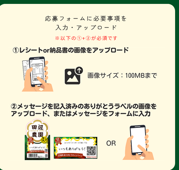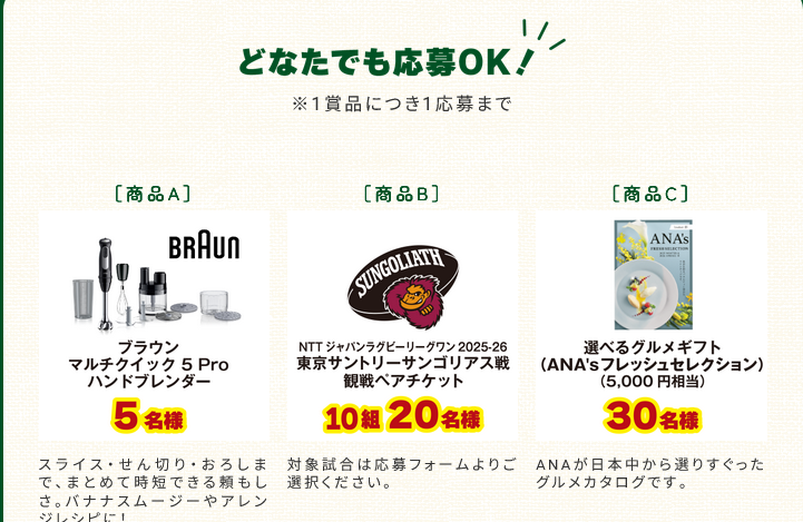 - 応募期間(2026年2月2日~2026年2月28日)中に田辺農園バナナを128円(税別)以上購入したレシートもしくは納品書の画像をお持ちの方(一部コンビニエンスストアを除く量販店および宅配などが対象)。
