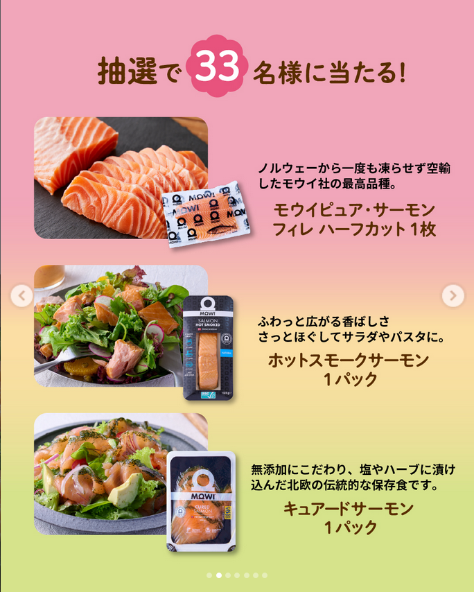 応募者の中から33名様に『モウイピュア・サーモン フィレハーフカット』、新商品の『ホットスモークサーモン』と『キュアードサーモン』をプレゼントいたします🐟