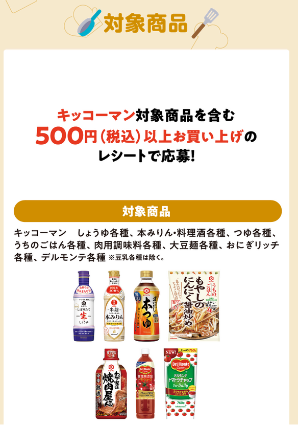 キッコーマン・デルモンテ対象商品を含む 500円(税込)以上お買い上げのレシートで応募!!